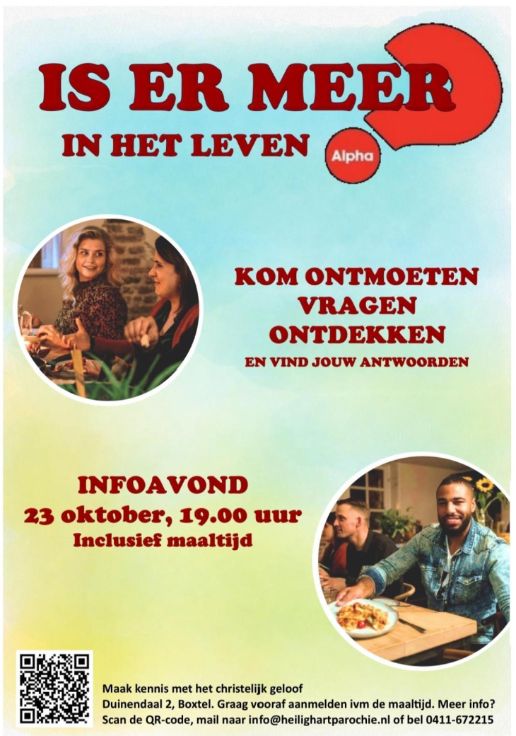 Als je wilt ontdekken of Alpha bij je past, we ontvangen je graag op onze info-avond op 23 oktober om 19.00u, Duinendaal 2 in Boxtel. Graag aanmelden i.v.m. de maaltijd.